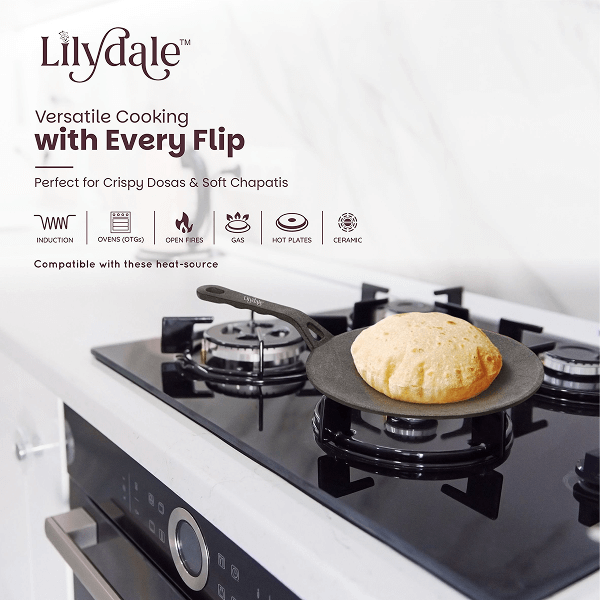 Because of its solid structure, cast iron heats evenly and retains heat for a long time, making it perfect for cooking Indian dishes like dosa, paratha, and sabji.