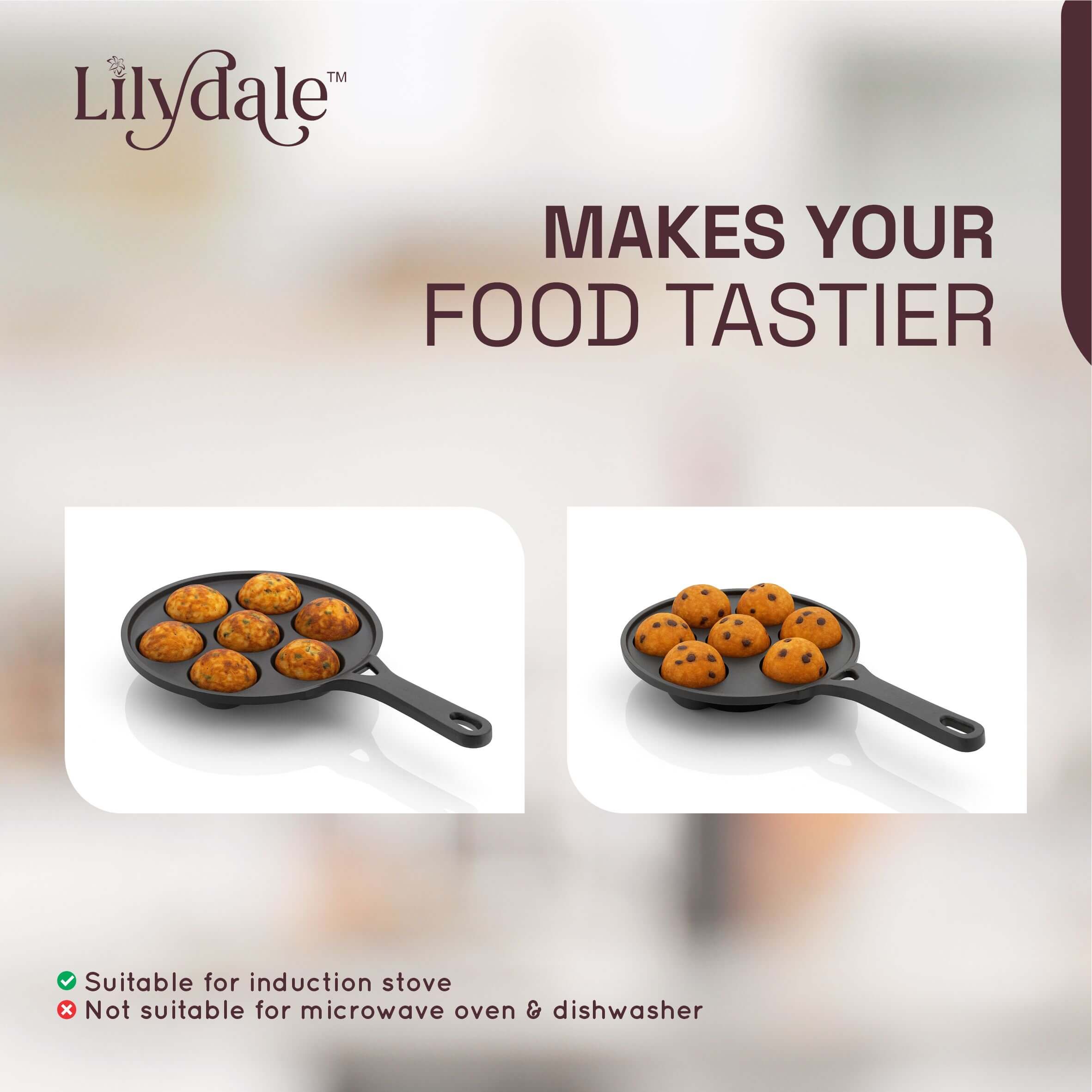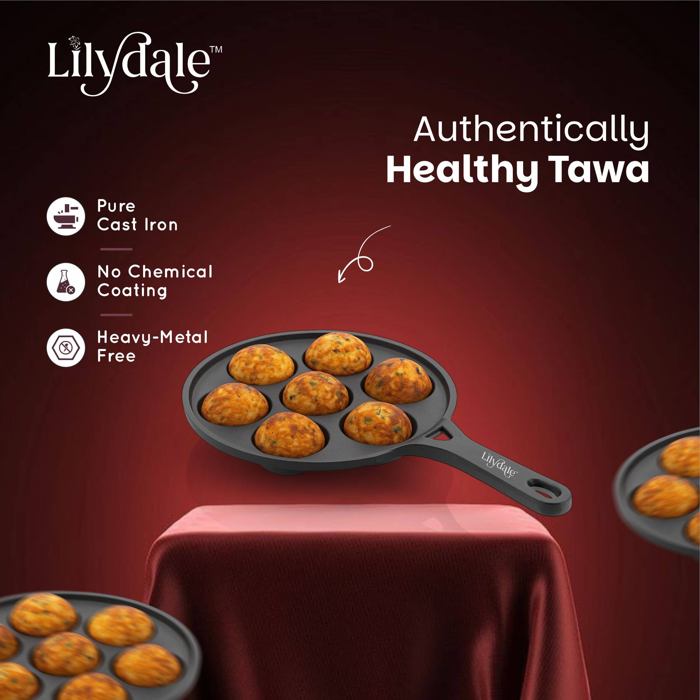 Lilydale 7Pits Cast Iron Appe/Unniyappam Chatty/Appam Pan/Ponganal/Paddu/Paniyarakkal/Litti Maker Handles/Paniyaram Stick 8.3"/21cm/1.8kg with Toxin-Teflon-Chemical Free PreSeasoned for Gas/Induction