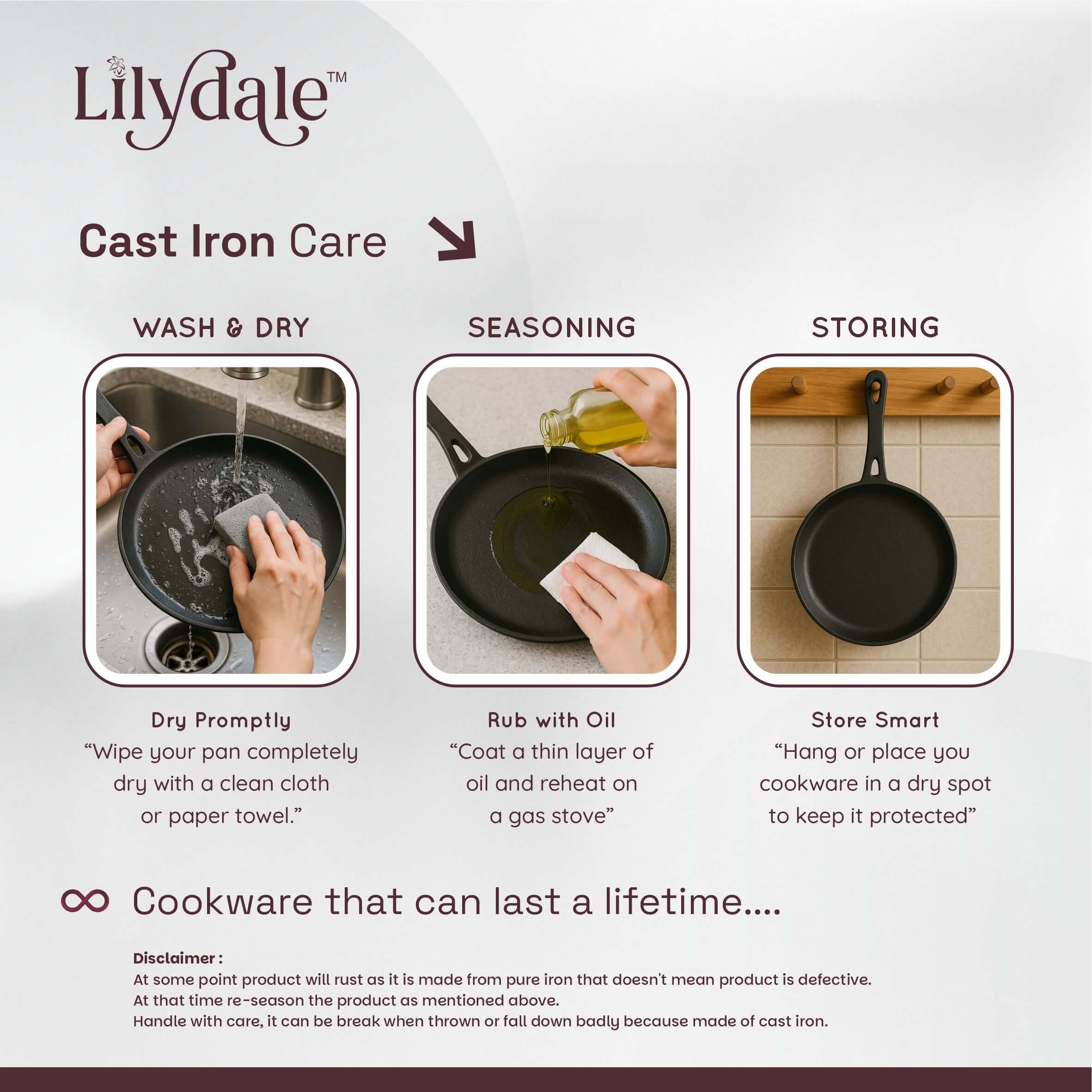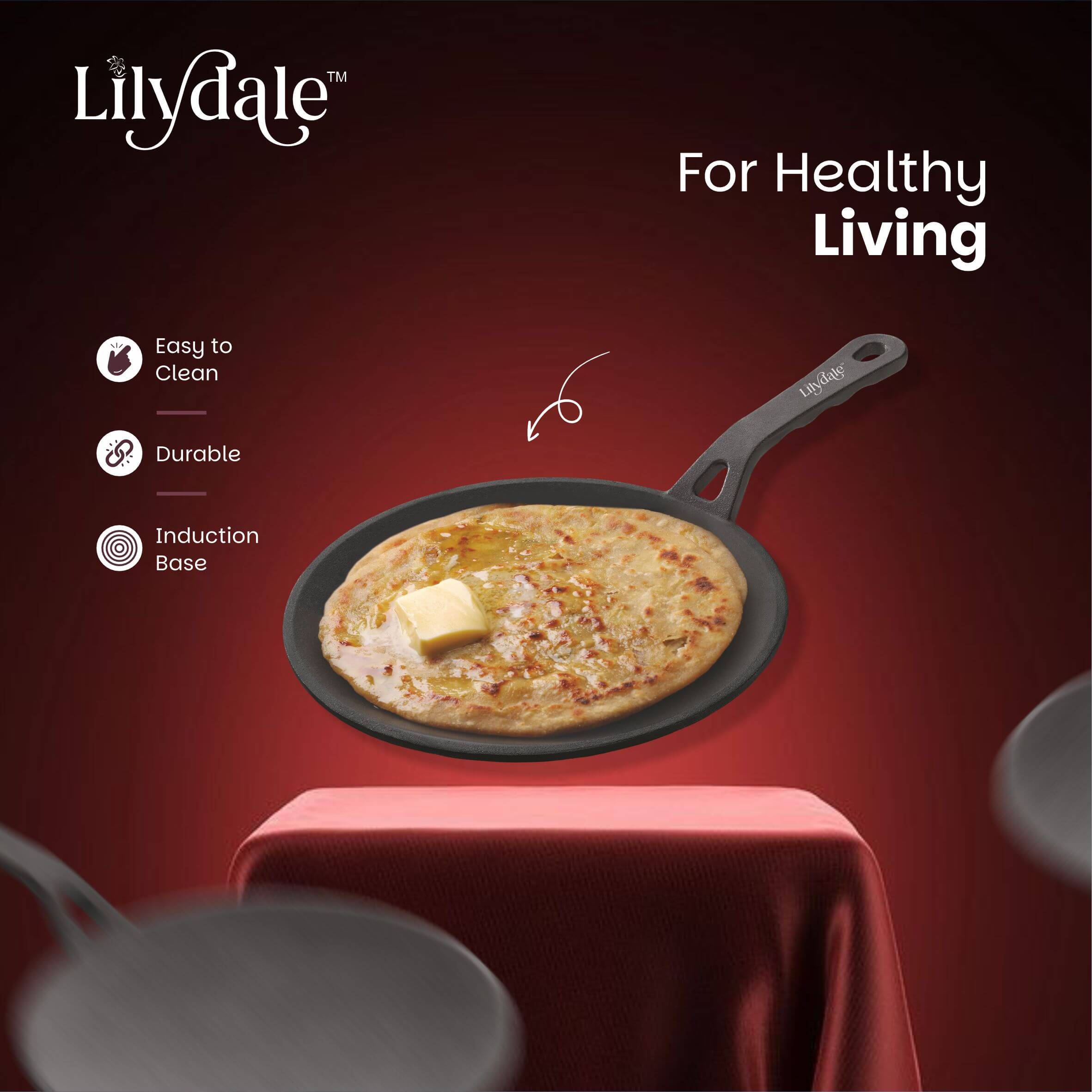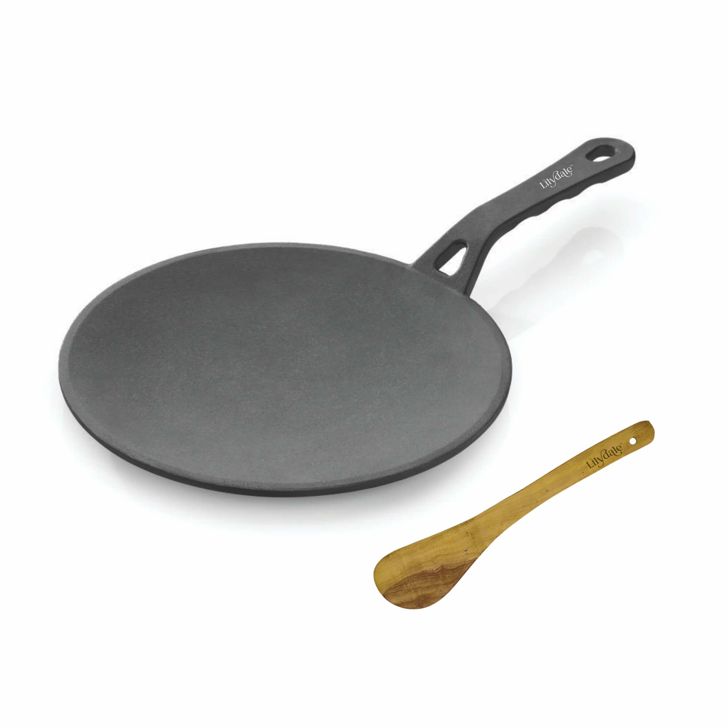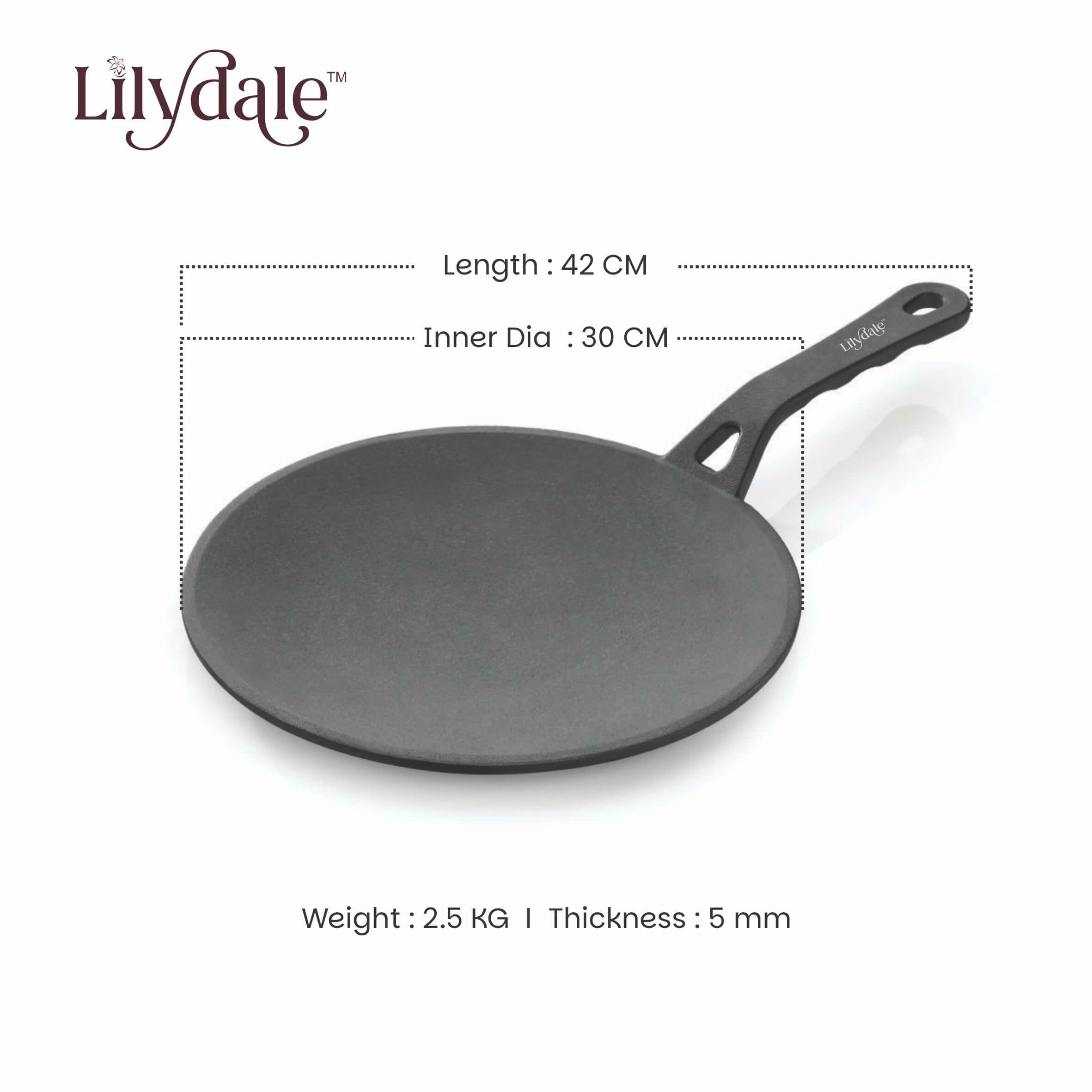 The Lilydale Cast Iron Roti Tawa (26cm / 10”, 2kg) is a durable and versatile flat pan designed for making perfectly cooked rotis, chapatis, naans, parathas, dosas, pancakes, tortillas, and flatbreads. Made from heavy-duty cast iron, it ensures excellent heat retention and even heat distribution for consistent cooking results. Pre-seasoned with natural vegetable oil, this tawa is 100% free from toxins, Teflon, and chemical coatings, making it a safe and healthy choice for everyday cooking. The ergonomic handle provides a firm and comfortable grip, while its sturdy design makes it suitable for gas stoves, induction cooktops, and open flames. Built to last for generations, the Lilydale Cast Iron Roti Tawa develops a natural non-stick surface over time, delivering authentic flavors and healthier meals with every use.