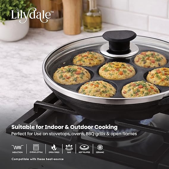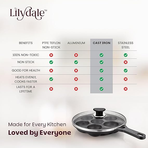 The Lilydale 7 Pits Cast Iron Appam Pan with Handles & Glass Lid is the perfect blend of tradition and convenience. Designed with 7 deep pits, it lets you prepare authentic South Indian favorites like appam, unniyappam, paddu, paniyaram, and litti with ease. Crafted from 100% pure cast iron, this pan ensures superior heat retention and even cooking for healthier, tastier dishes. Its dual-handle design provides a firm grip, while the transparent glass lid helps you monitor cooking without losing heat or flavor. Pre-seasoned for immediate use, it naturally becomes more non-stick with regular cooking and is completely free from toxins, Teflon, and harmful chemicals. Suitable for both gas stoves and induction cooktops, it offers versatility and durability for everyday cooking. Bring home the Lilydale Cast Iron Appam Pan and enjoy a lifetime of safe, traditional, and wholesome cooking.