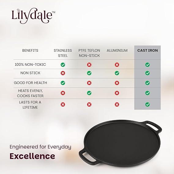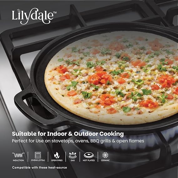 Lilydale Double Handles Dosa Tawa/Adakkal with Wooden Spatula 26cm/2200g/10.5/2.28kg Cast Iron 100% Toxin-Teflon-Chemical Coating Free PreSeasoned Multiuse Long-Lasting Gas/Induction Compatible