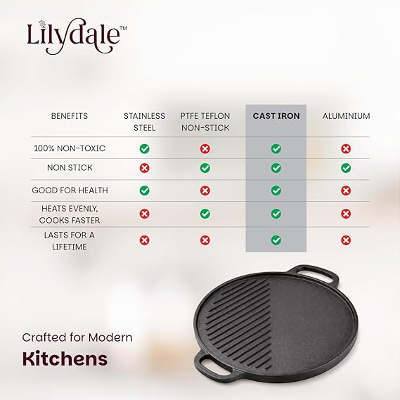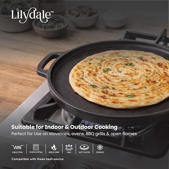 Lilydale 2in1 Double Side Reversible Tawa & Grill Pan with Two Handles 12"/30cm/3.22kg Multiuse Cast Iron PreSeasoned 100%Toxin Teflon Chemical Coating Free Gas/Induction Friendly for Dosa Fish & BBQ