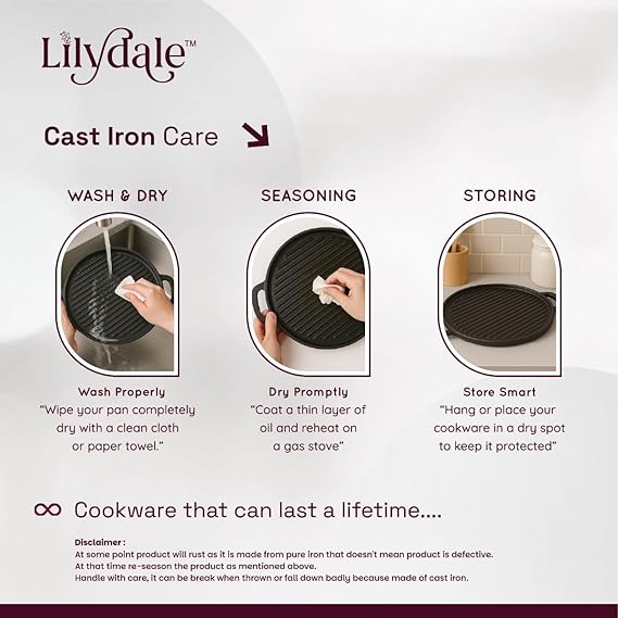 Bring home the traditional taste of Indian cooking with the Lilydale Double Handles Cast Iron Dosa Tawa/Adakkal with Wooden Spatula (30cm / 12” / 3kg) — a perfect blend of strength, safety, and performance. Crafted from premium-quality, pure cast iron, this tawa ensures even heat distribution for consistently crisp and golden dosas, rotis, chillas, and parathas every time. Unlike non-stick cookware, this 100% toxin-free, Teflon-free, and chemical-coating-free tawa offers a natural and healthy cooking experience. It comes pre-seasoned with vegetable oil, providing an easy-release surface that only gets better with use. The double-handle design ensures a firm and comfortable grip, making it safe and convenient to handle even when hot. Built to last for generations, the Lilydale cast iron tawa is highly durable, multiuse, and suitable for both gas and induction cooktops. Its heavy base retains heat longer, reducing cooking time and saving energy. The included wooden spatula adds a rustic charm while protecting the tawa’s surface from scratches. Whether you’re preparing traditional dosas, crispy uttapams, or perfectly roasted chapatis, this versatile cookware brings authentic flavor and unmatched durability to your kitchen — the way cooking was meant to be.