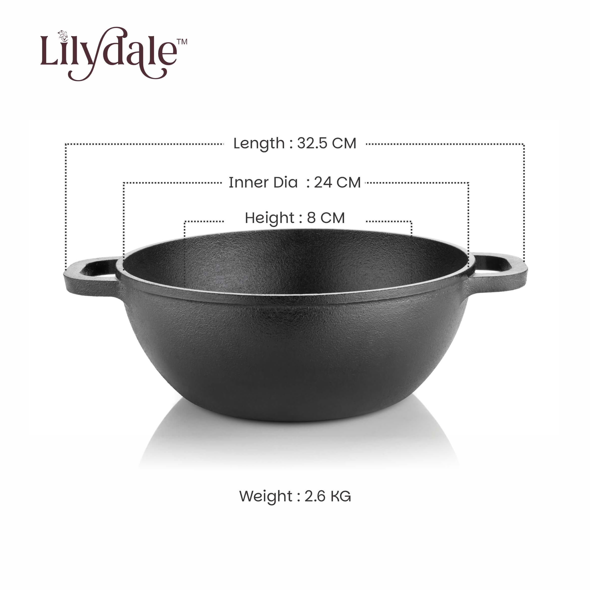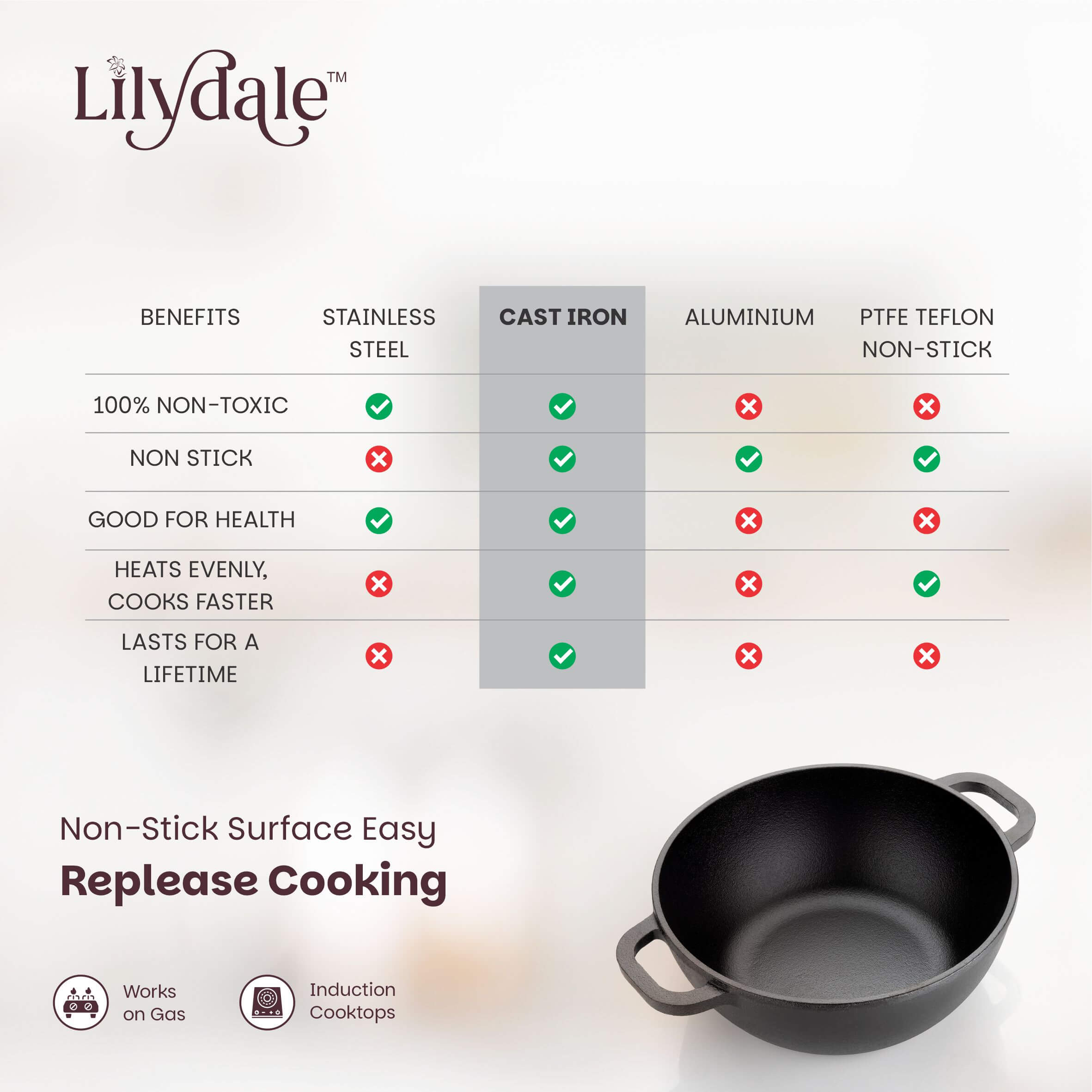 Lilydale Cast Iron Small Curved Handles Kadai (24cm/9.5", 2.65kg, 3L) is a durable, pre-seasoned cookware designed for authentic cooking. Made from 100% toxin, Teflon, and chemical coating–free cast iron, it naturally enhances flavors while ensuring safe and healthy meals. Its curved dual-handle design makes it easy to lift and serve, while the heavy-duty build retains and distributes heat evenly. Compatible with gas stoves and induction cooktops, this versatile kadai is perfect for searing, stewing, frying, and preparing dishes like biryani, sabzi, and rich gravies.