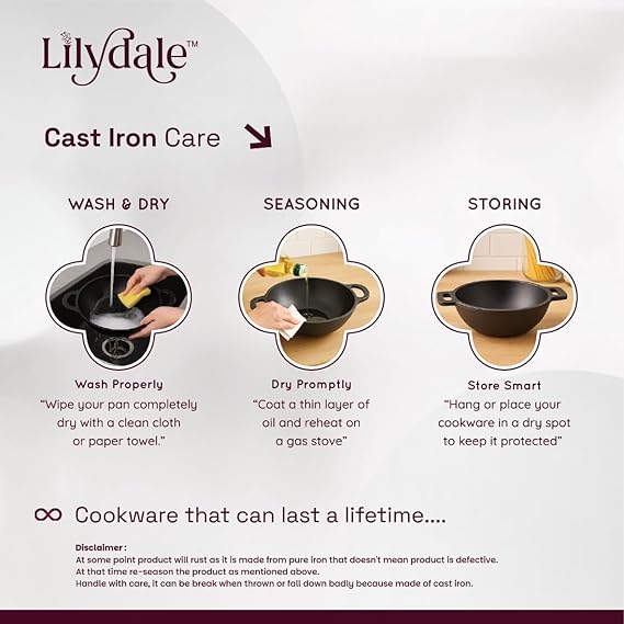 - MAINTENANCE : Hand wash recommended with warm water, dry thoroughly, and apply a light coat of cooking oil after each use