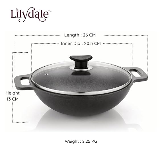 Lilydale Cast Iron Small Kadai with Handle/Glass Lid/Wooden Spatula 20.5cm/8"/2.25kg/2.5L 100% Toxin-Teflon-Chemical Coating Free PreSeasoned Multiuse Gas Induction Friendly Cooking/Searing/Stewing