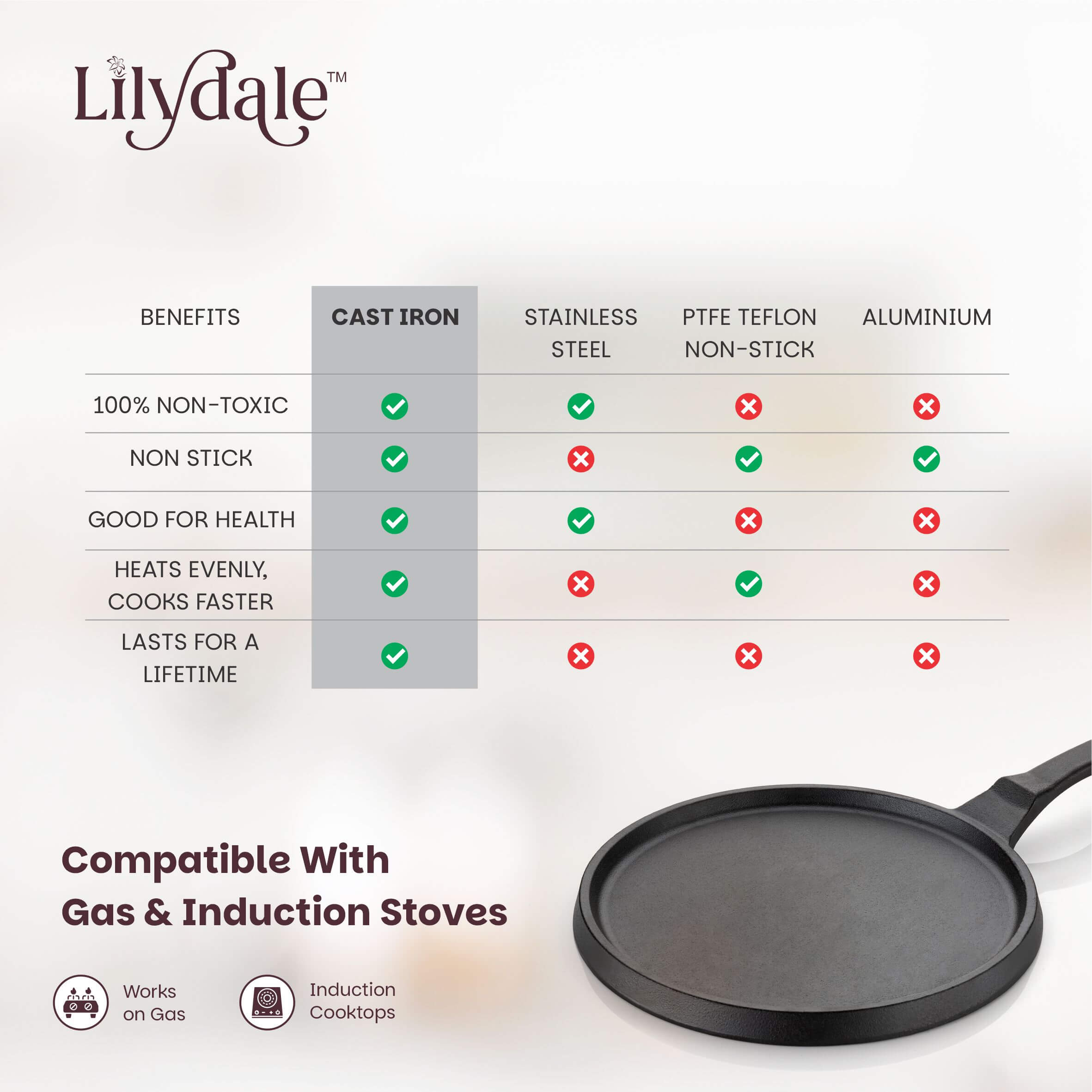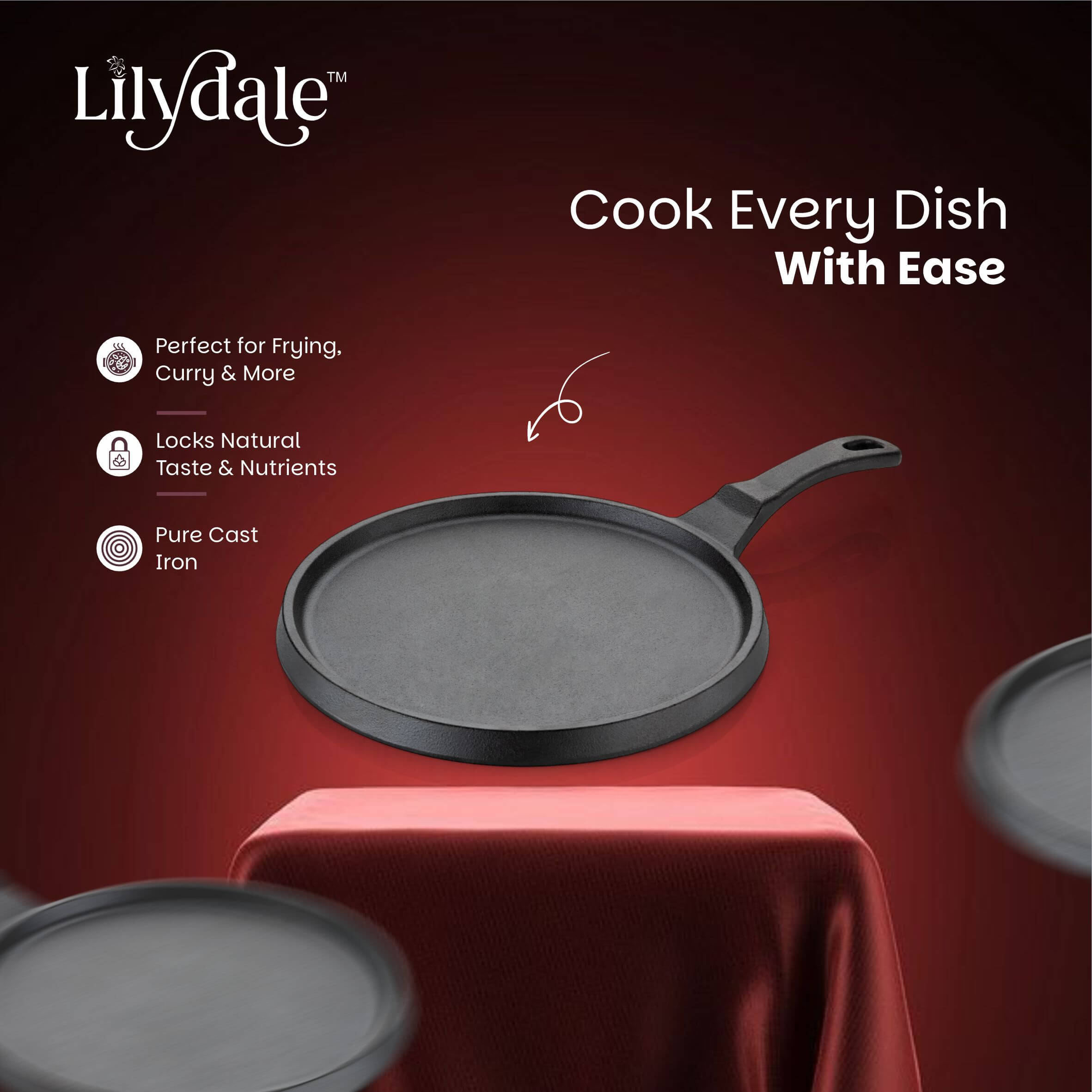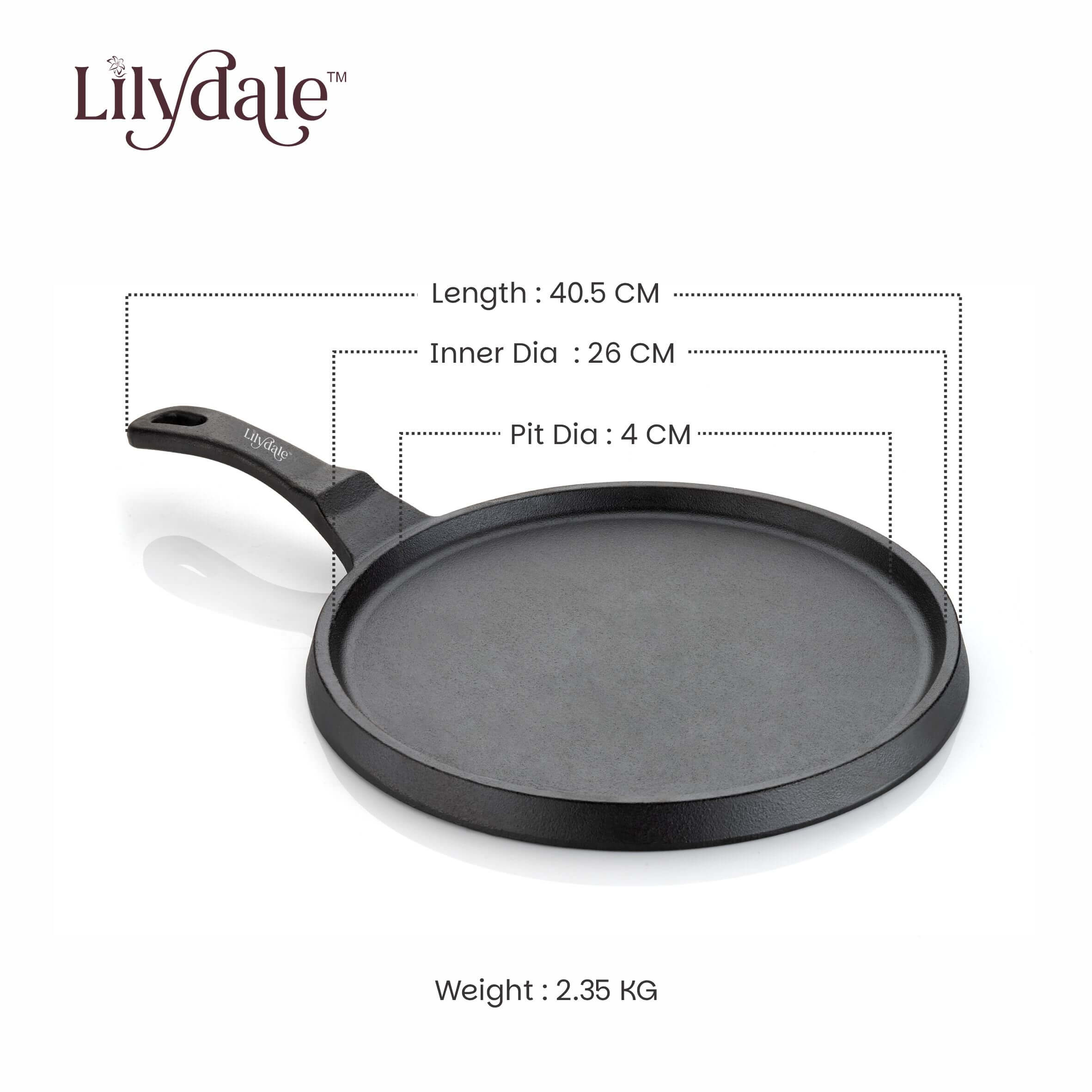Experience authentic cooking with our 10-inch Cast Iron Pizza/Shallow Pan, crafted for those who value flavor, durability, and health. Made from premium cast iron, this pre-seasoned pan is 100% free from Teflon, toxins, and harmful chemical coatings, ensuring a naturally non-stick cooking experience that only gets better with time. A robust build (2.35 kg), this pan offers even heat distribution—perfect for achieving crispy pizza bases, searing spices, roasting vegetables, or shallow frying with ease. Its 2350gm capacity makes it ideal for both everyday meals and weekend treats. Compatible with gas stoves and induction cooktops, and designed with a sturdy side handle for secure grip and easy maneuvering, this 26cm multi-use pan is a must-have addition to every health-conscious kitchen.