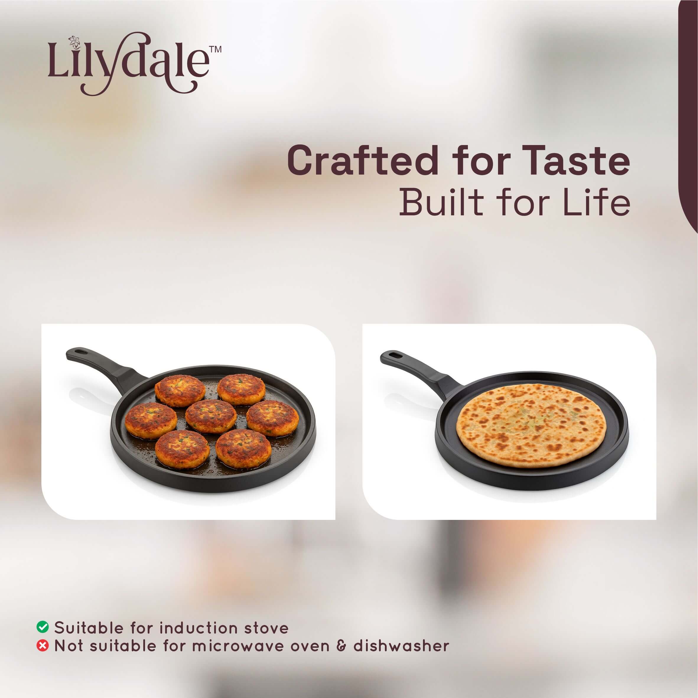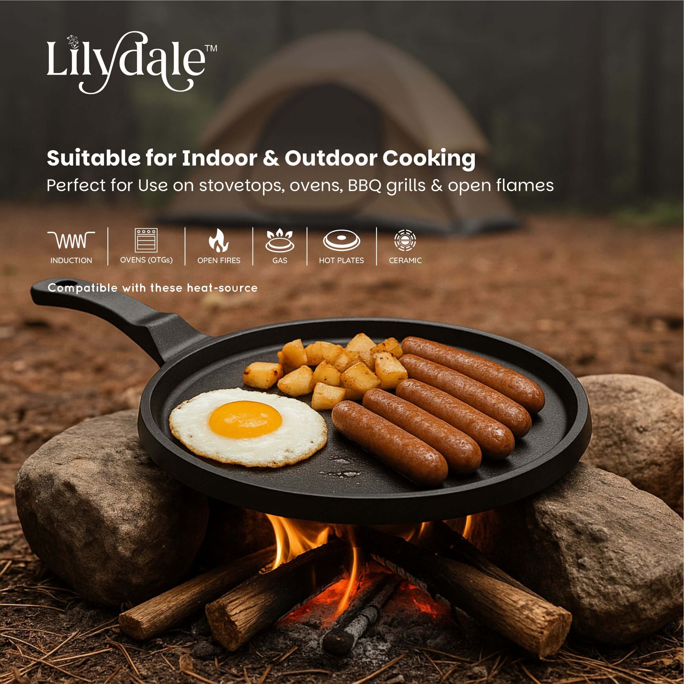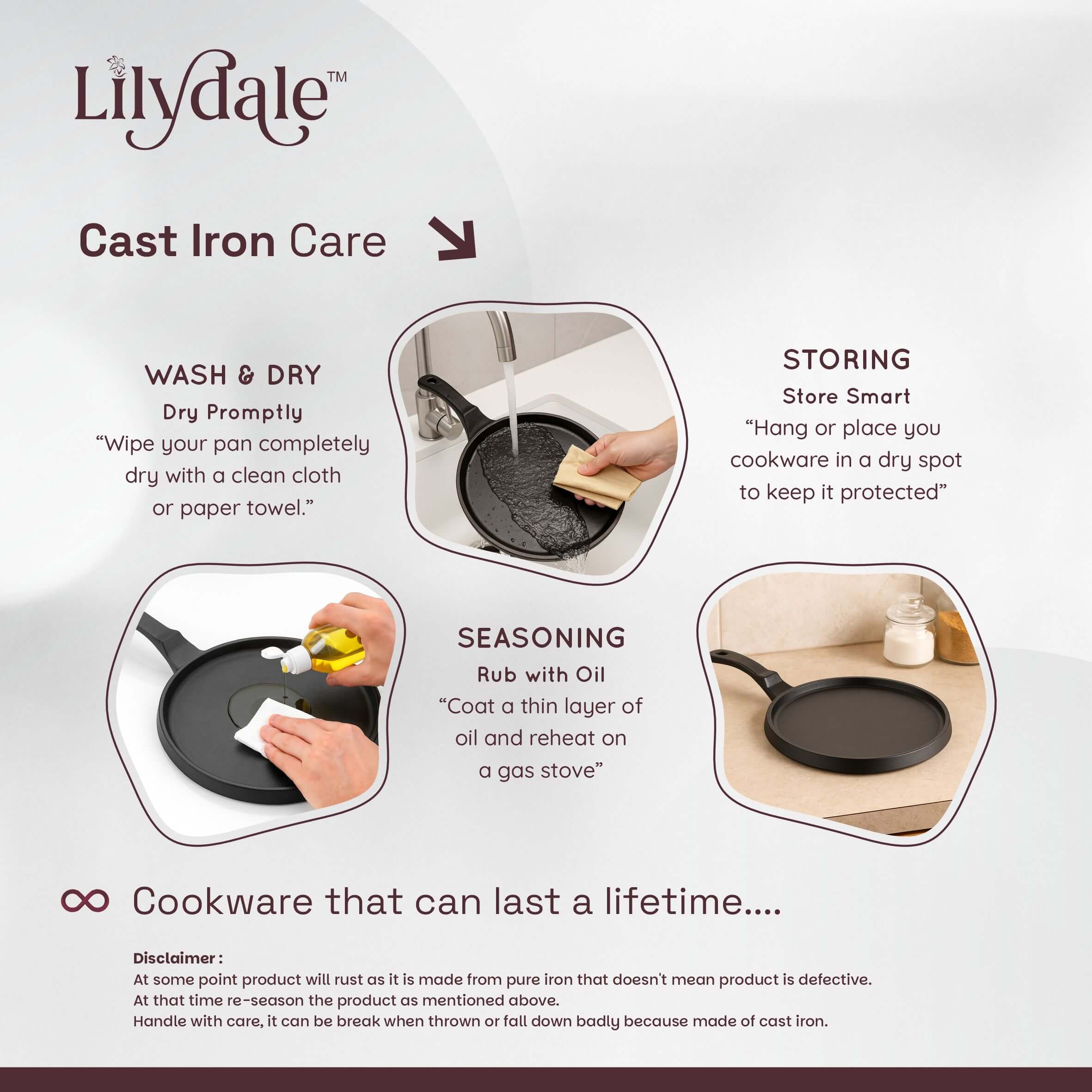 Experience authentic cooking with our 10-inch Cast Iron Pizza/Shallow Pan, crafted for those who value flavor, durability, and health. Made from premium cast iron, this pre-seasoned pan is 100% free from Teflon, toxins, and harmful chemical coatings, ensuring a naturally non-stick cooking experience that only gets better with time. A robust build (2.35 kg), this pan offers even heat distribution—perfect for achieving crispy pizza bases, searing spices, roasting vegetables, or shallow frying with ease. Its 2350gm capacity makes it ideal for both everyday meals and weekend treats. Compatible with gas stoves and induction cooktops, and designed with a sturdy side handle for secure grip and easy maneuvering, this 26cm multi-use pan is a must-have addition to every health-conscious kitchen.